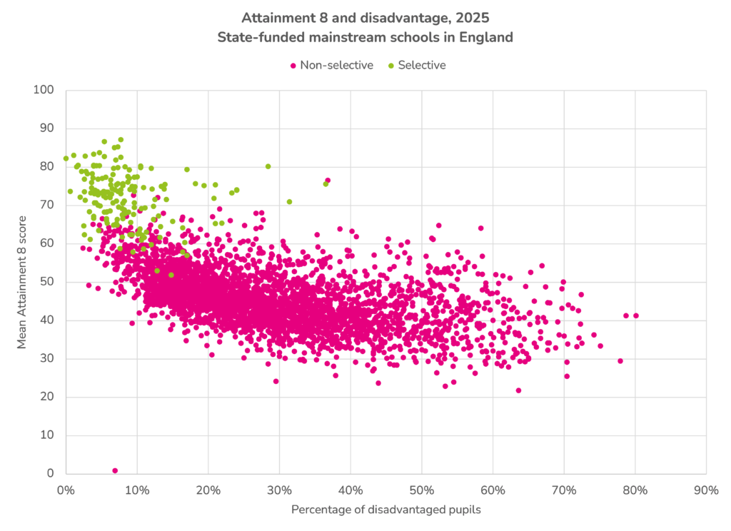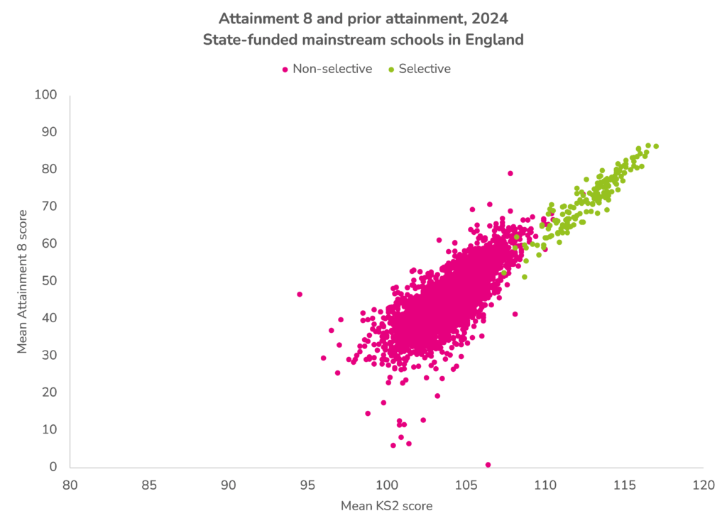The immediate reaction to these charts (credit FFT Education Data Lab) is that a school’s outcomes simply mirror their intake. High grades in, high grades out.